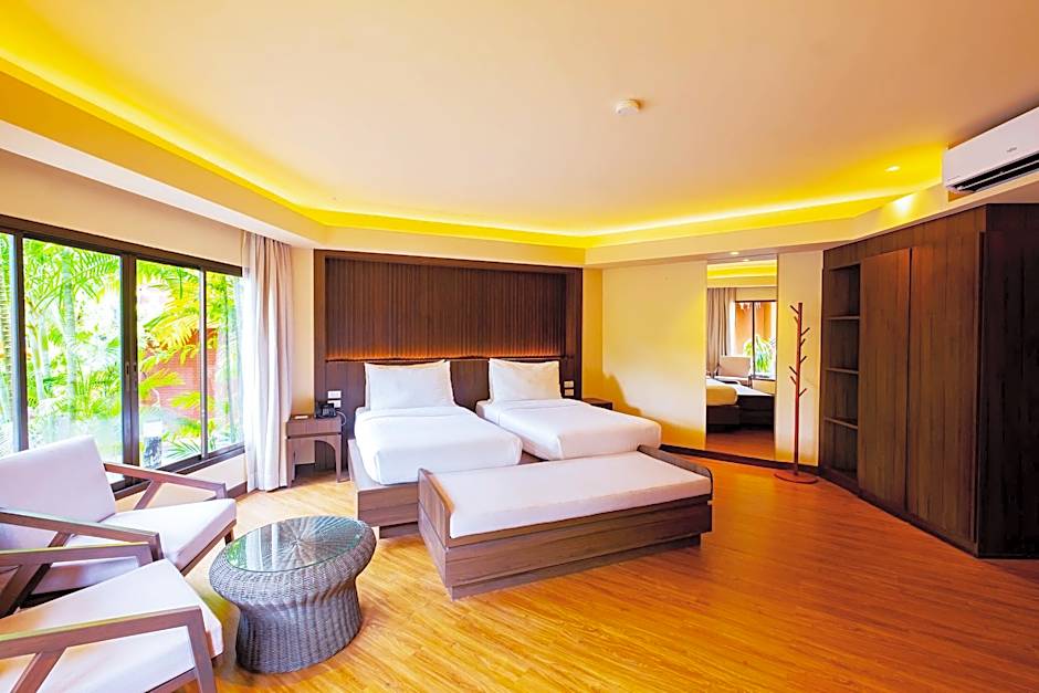Enjoying beautiful sea and pool views, modern contemporary-design room features a see-through glass partition in the bathroom.